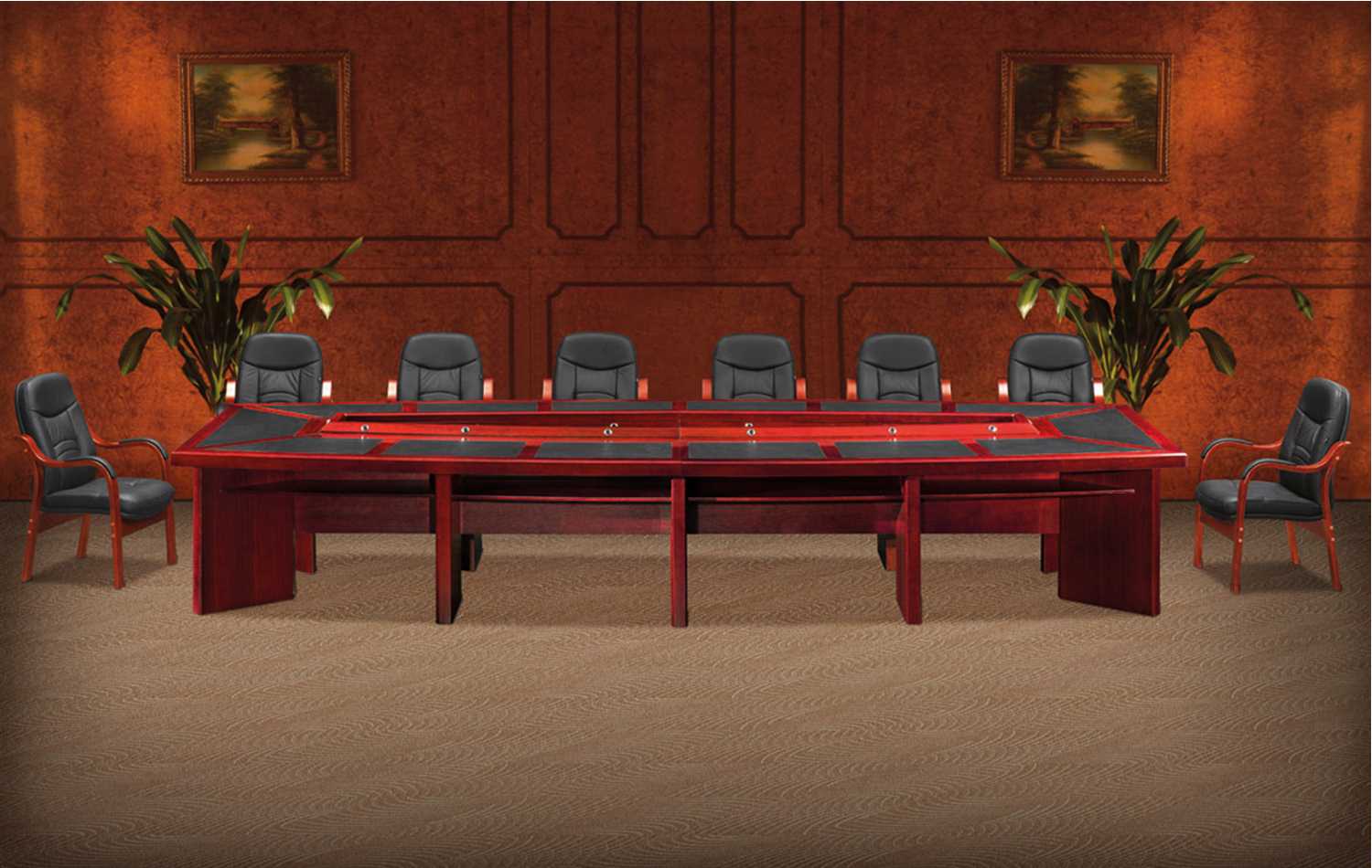 This boardroom table is made of mahogany veneer finish and it has a 70mm thick top. The double layer top gives you extra space for your books and stationery. It has sand blasted glass inlay in the center as well as aluminium cable or speaker wholes and seats 14.