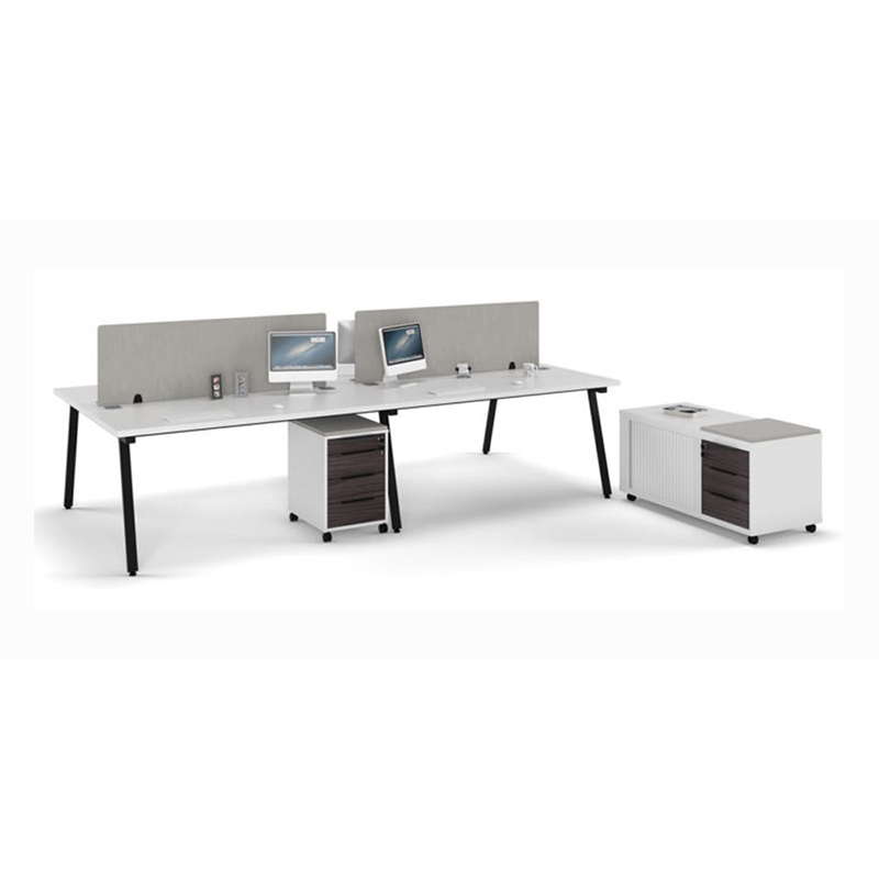 Open Plan Desk: (H 750 x W 1200 mm) / (H 750 x W 1350 mm) / (H 750 x W 1600 mm) / (H 750 x W 1800 mm) Features: 25 x 50 A Frame Steel Leg / Fabric or Perspex Screen Optional: Mobile Pedenza with Fabric Cushion / Mobile Pedestal