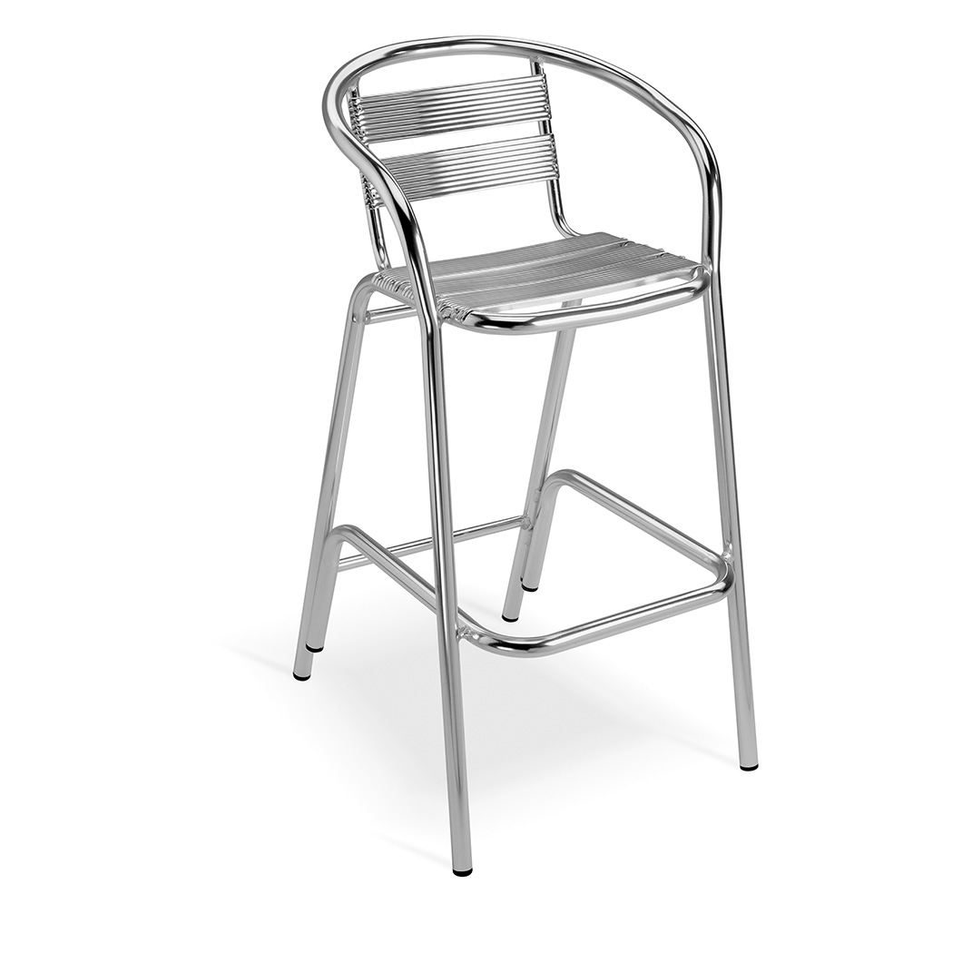 Stackable high end barstool suitable for continuous outdoor use in all conditions. Aluminium fabrication, locally finished with exterior epoxy finish in a multitude of colours.