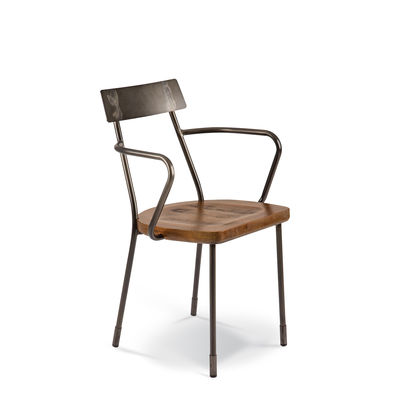 Industrial style comprising steel frame and backrest with chunky dished timber seat.
