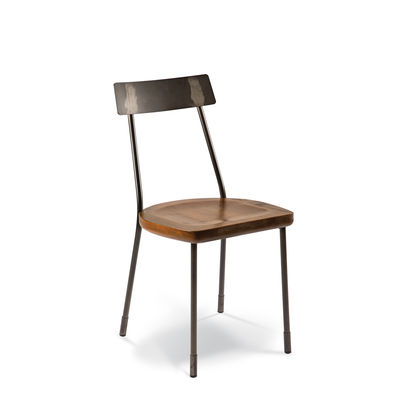 Industrial style comprising steel frame and backrest with chunky dished timber seat.