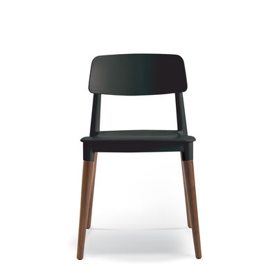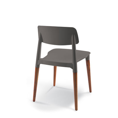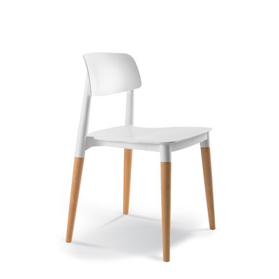 Polyprop seat and back with solid Beech legs. Natural finish is standard. Darker stains optional. Stackable 3 high.