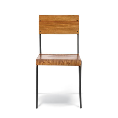Industrial vintage look comprising moulded plywood seat and back on epoxy coated steel frame.