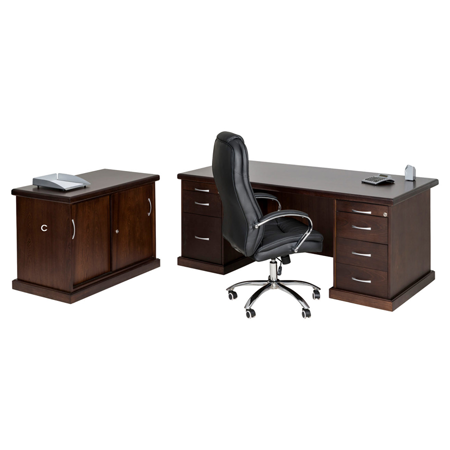 A: Double Pedestal Desk 1800 x 900 (1 x Filing Drawer + 4 x Drawers) B: 1 Piece Wall Unit 2 Door Base + 2 Glass Door Top